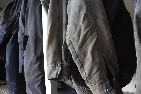 在這間“衣帽間”里,有的衣服破了幾個洞,然后又拿補丁補了繼續(xù)穿;有的衣服那個臟亂,簡直不想拿手觸碰;有的衣服掉了扣子、壞了拉鏈,還有那些帽子,不知是帽子碰到了機器,留下痕跡,還是機器的零件掉了下來,砸到了帽子,砸出了一道道的痕跡。